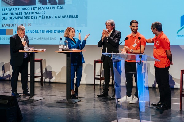 >> Les Olympiades des métiers ont été mises en lumière, à travers notamment le témoignage de Matéo Pujal, qui a reçu la médaille d’excellence 2025 à l’épreuve de maçonnerie, et de Bernard Guasch, son Entraîneur, Président régional des métiers de la maçonnerie et du gros-œuvre, et Administrateur FFB LANDES.